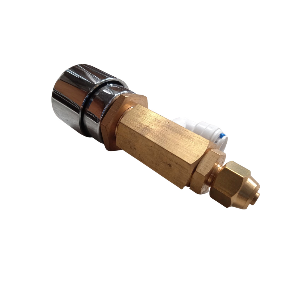 Llave para bebedero fabricada en latón cromado, con botón y conexión de 1/4″.